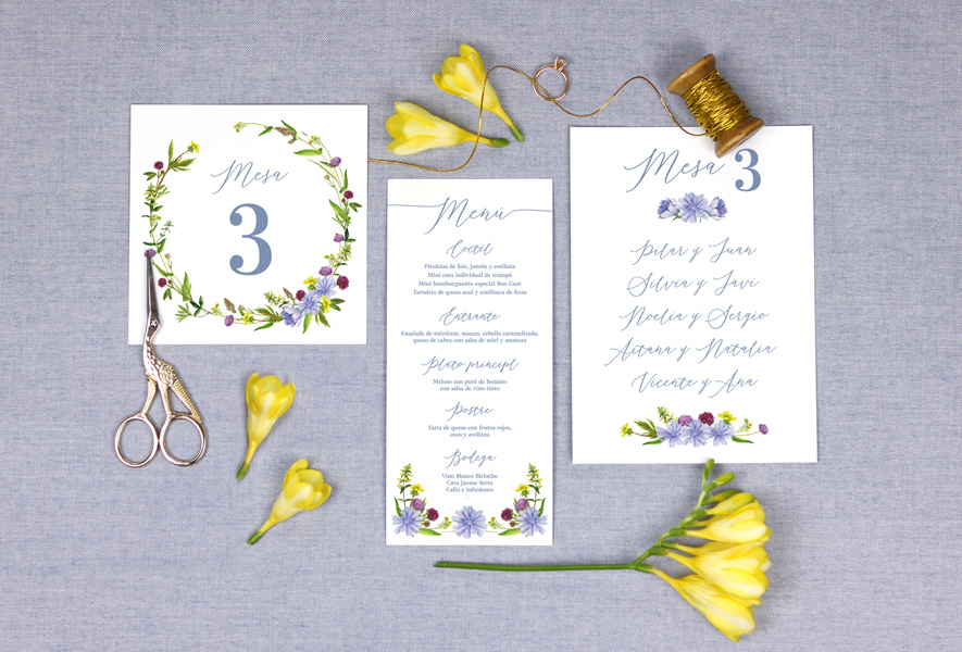 Campoamor, el tarjetón creado especialmente para las bodas donde la naturaleza juega un rol importante. Recuerda a un prado lleno de flores campestres, bañado en el cálido sol de verano. Los delicados dibujos de flores acompaña una romántica tipografía manuscrita. El tarjetón viene acompañado de un sobre forrado a juego y un discreto detalle de una etiqueta con los iniciales de los novios. El diseño esta impreso sobre un excelente papel italiano con suvae acabado marcada a fieltro por las dos caras que dan la apariencia de papel de acuarela.