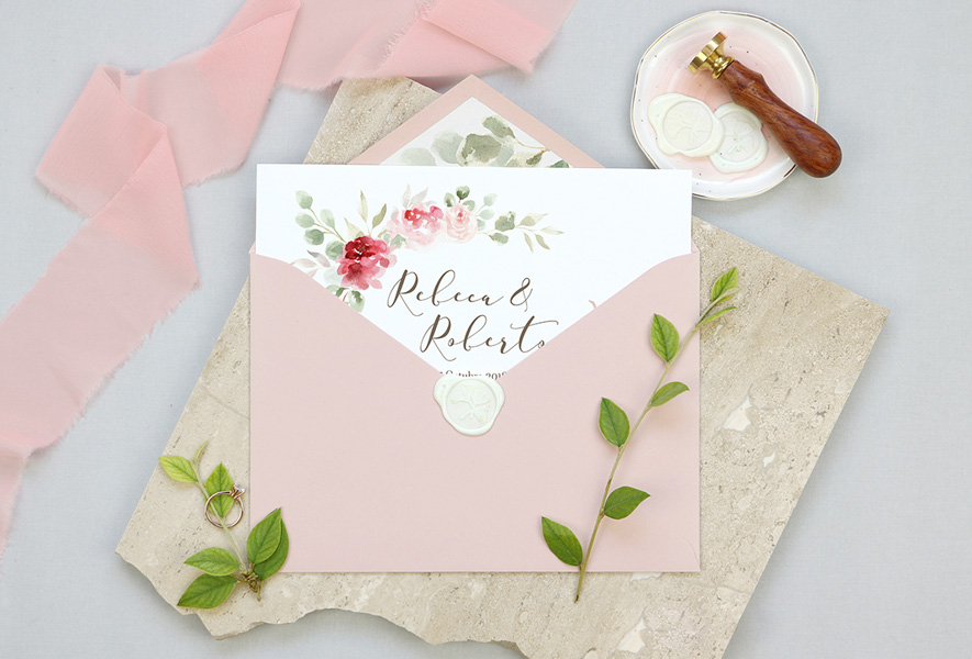La invitación Chérie es una propuesta de lo más romántica. Su formato tradicional le da un punto adicional de elegancia, tan buscado en el día de un acontecimiento tan importante como es vuestra boda. Sobre en precioso color rosa palo, forrado con una delicada ilustración de hojas que tienen su continuidad en el tarjetón, acompañando esta composición floral a la moderna tipografía manuscrita que detalla toda la información sobre vuestro enlace. Como elemento diferencial existe la posibilidad de cerrar el sobre con un sello de lacre.