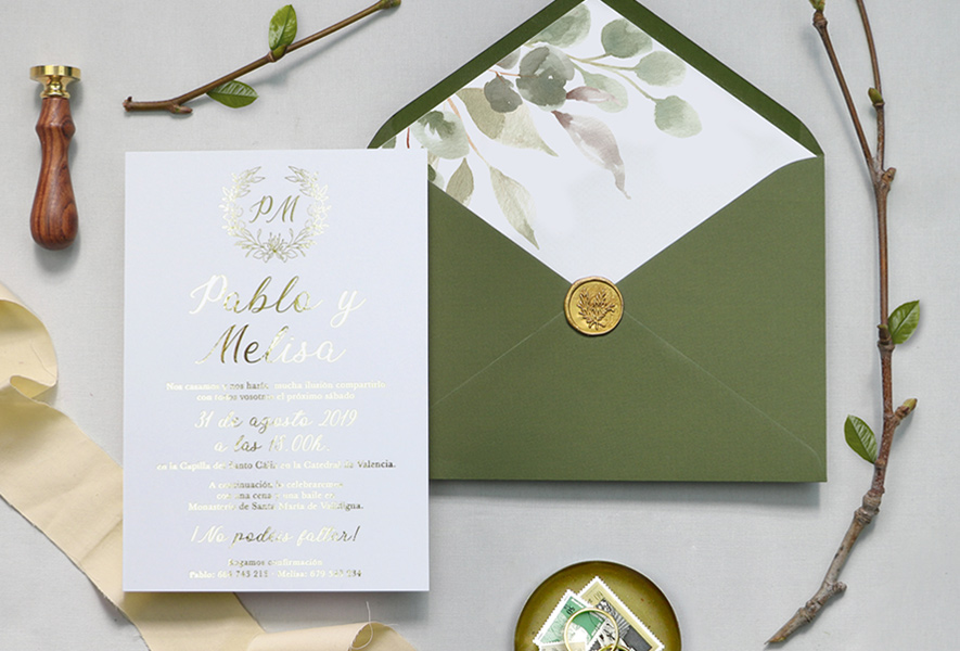 Invitación Eucalipto es la invitación perfecta para los novios que quieren optar por la elegancia moderna. Un tarjetón metalizado en dorado con la técnica de metalizado digital esta acompañado de un sobre forrado de alto gramaje en un precioso color verde oliva con agradable textura. El forrado interior lleva impreso un delicado dibujo de hojas de diferentes variedades de plantas, entre ellas el eucalipto. Las mismas plantas encontramos formando la corona con los inciales de los novios en la parte superior del tarjetón. Podéis elegir entre tres forros diferentes para acompañar el tarjetón.