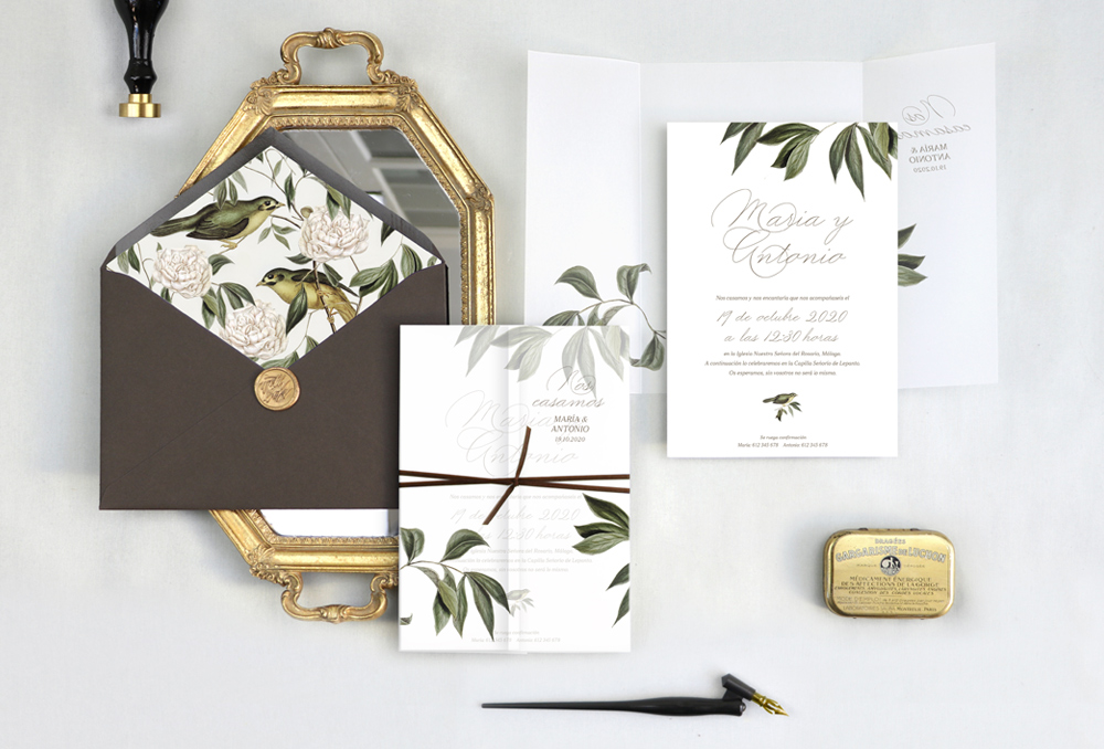 Medidas tarjetón: 15x21,5cm. Sobre marrón oscuro (también queda espectacular con el sobre verde oliva), 140g, medidas: 16,2x22,9cm.