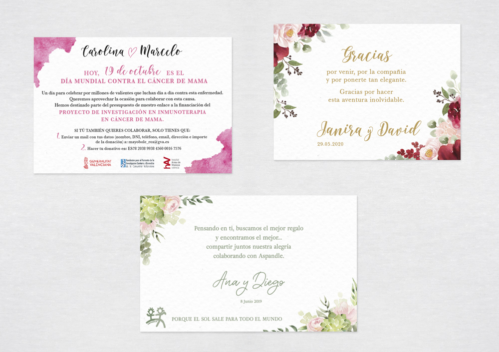Cada tarjeta de agradecimiento se imprimirá a todo color sobre el mismo papel de calidad elegido del tarjetón principal de la invitación de vuestra boda y estará totalmente personalizada y a juego con vuestro diseño.